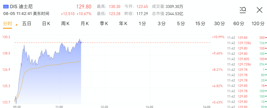 华盛资讯8月5日讯,Q3意外实现盈利后,迪士尼(DIS)获多家大行上调目标价,股价一度涨近11%。截至发稿,迪士尼涨10.67%,报129.8美元,当前总市值达2344.53亿美元。