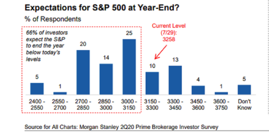 在不同寻常的这一年中,当疫情肆虐之际,反弹的股市将估值推到了二十年来高点,市场人士正在选择该站在哪边。摩根士丹利调查中的投资者指出,从健康危机到疲软的经济以及11月的总统大选,这些都是最大的市场风险,但顺势而为的投资者却担心会错过机会。