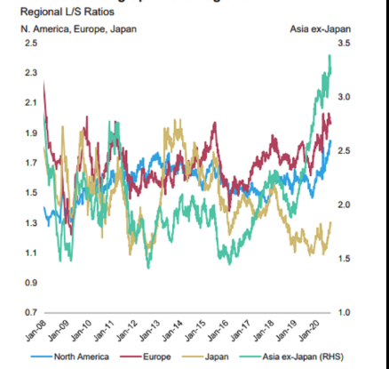 多空对冲基金经理通常会选择单个股票,而不是进行广泛的市场押注。摩根士丹利表示,他们最新的看涨立场部分是由空头回补推动的,该过程减少了看跌押注。净杠杆是衡量行业风险偏好的一种指标,考虑了多对空,上个月该指标达到了两年来的最高水平。