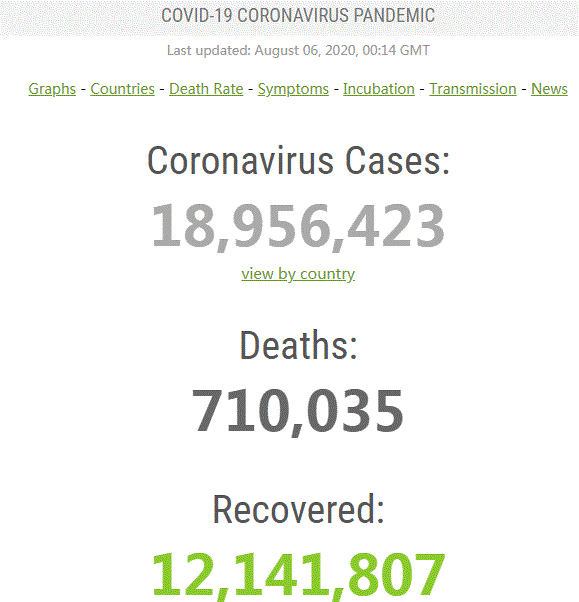 Worldometers世界实时统计数据显示,截至北京时间8月6日8时14分,全球新冠肺炎累计确诊病例突破1895万例,达到18,956,423例,累计死亡病例超过71万例,达到710,035例。