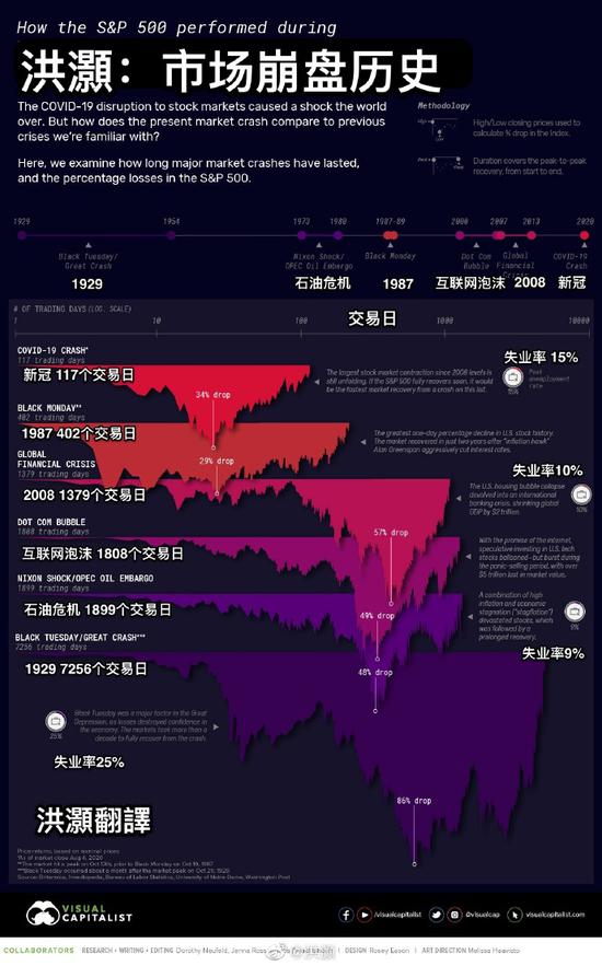 1929年以来,美国市场崩盘历史。崩盘发生的越来越频繁,但是持续时间越来越短,深度似乎越来越浅,但对实体经济的影响越来越大(以失业率计算)。