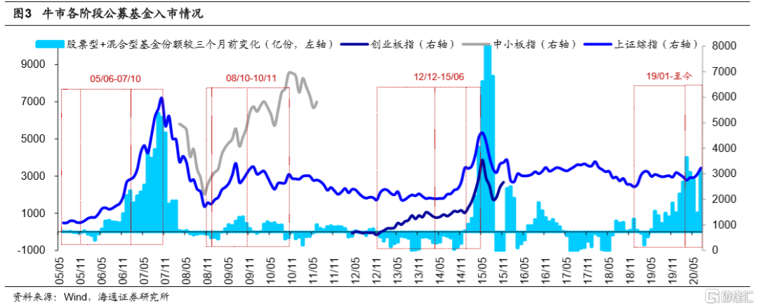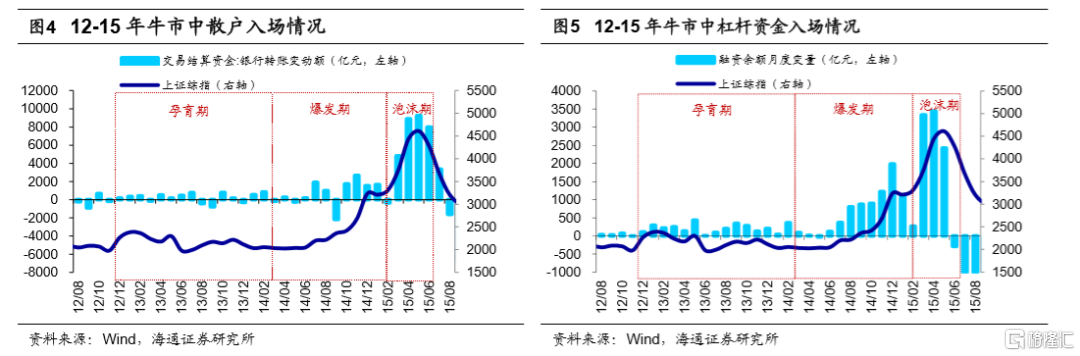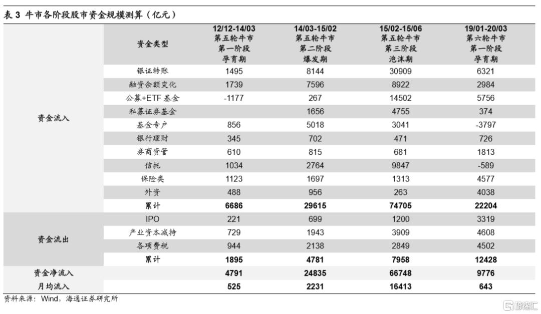 牛市各阶段的资金入市特征:孕育期存量资金活跃,爆发期增量资金入场。我们在前期报告《牛市有三个阶段——20190303》以及《以史为鉴:牛市的资金入市节奏-20190703》中将牛市分为孕育期(包括牛市1浪上涨+2浪回调)、爆发期(3浪上涨+4浪回调)、泡沫期(5浪冲顶)三个阶段,并回顾了历次牛市中各个阶段资金面的特征,得出的结论是,在牛市孕育期,场外的增量资金尚在观望,指数的上涨主要由场内资金的高换手来推动,如12-15年牛市中,以创业板指来划分的牛市孕育期为12/12-13/04,以上证综指来划分的孕育期为13/06-14/03,我们统计整个12/12-14/03期间的资金情况,期间银证转账资金月均净流入200亿元左右,散户并未大幅入场,股票型与混合型基金也未流入,月均资金流出100亿元,杠杆资金月均流入也只有200亿元。场外资金真正入场要等到爆发期后期,还是以12-15年牛市为例,爆发期和泡沫期对应的时间分别为14/03-15/02与15/03-15/06,银证转账在两个阶段的月均净流入分别为700亿与7600亿元,股票型基金与混合型基金月均净流入分别为60、3500亿元。此外,12-15年我国金融创新兴起,表现为场外结构化产品大量发行,场内杠杆资金迅速发展。场外的数据我们无法监测,场内杠杆看融资余额,融资余额在牛市后两个阶段分别月均增加700、2200亿元。险资运用余额中股票和基金的占比从孕育期末的10.3%先上升至爆发期的12%,然后在泡沫期达到最高的16%。同样的规律也在05-07年以及08-10年牛市中出现,由于当时资金面指标尚不完整,我们用别的指标进行替代,资金面的特征在这两年较早的牛市依旧存在,详细分析见前述报告《以史为鉴:牛市的资金入市节奏-20190703》。