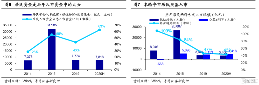 上半年最大的资金来源于居民,下半年居民资产配置将继续偏向权益。从我们测算的股市资金面情况看,无论是牛熊周期视角下还是自然年视角下,居民都是推动行情最重要的资金来源:比如14年全年股市资金面流入项合计为2.6万亿元,其中居民项(银证转账+公募基金)为7000亿,居民项占比近1/3,15年这一比例为55%,19/20年分别约为40%和60%,居民均为绝对的大头。与此同时,近年来居民入市的方式也在改变,以往居民喜欢自己炒股,如12-15年牛市中银证转账与公募基金入市规模的比例约为3比1,但是19年以来居民开始通过买基金间接入市,19年以来这轮牛市中银证转账与公募基金的比值为1比1.5。当前居民储蓄存款规模约为70万亿元,居民潜在入市的资金规模还很大。展望下半年,我们认为居民资金入市的趋势并不会改变。在《大浪潮:居民从购房到配股-20200213》中我们指出,借鉴美日经验,居民资产配置结构受到国家产业结构和股市制度影响。工业发达的社会融资方式以银行信贷为主,居民资产配置也是高配地产和现金固收类,低配权益;服务业发达的社会股权融资发达,因此居民会高配权益资产。过去20年由于工业化和城镇化发展,我国居民的资产配置结构是高配地产、低配权益。截止2019年我国居民资产中地产、股票+基金、其他三类的比重为59%、2%和39%,美国为24%、34%和41%。但是向后展望,我们认为居民资产配置的方向将从房产转向权益资产,原因一是经济由工业化时代走向信息化时代,地产在经济中的重要性会下降,新兴产业将加大股权融资的需求;二是金融供给侧改革后权益资产的性价比上升。类似1980年代美国,未来居民资金将会大幅入市,现在小荷才露尖尖角。