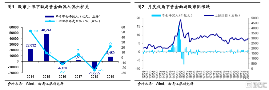 自然年角度:上涨年份流入,下跌年份流出。我们测算股市资金面的情况主要测算流入流出两方面,流入股市的资金主要有4个来源:散户资金(银证转账)、杠杆资金(融资余额)、国内机构资金(基金、保险、社保等)、海外资金(QFII与陆港通)。流出股市的资金主要有3个去向:IPO融资、产业资本净减持、交易费用(融资费用、印花税和交易佣金)。定增资金由于退出的主要渠道就是产业资本减持,因此不做单独统计。具体统计指标上,散户资金2017/06以前我们用中国证券投资者保护基金公司公布的“证券市场交易结算资金:银证转账变动净额”来衡量,17/06后由于前述指标停止更新,改用中国证券业协会每季度公布的“证券公司客户交易结算资金”;公募基金我们使用股票型基金与混合型基金的月度份额变化量×上月基金单位净值×上月基金仓位来近似获取当月公募基金流入股市的资金量;险资等其他资管资金用资金规模×估测仓位来代表持股市值,并用持股市值作差来代表资金变动;外资高频数据我们用陆股通每日净买入来监测,低频数据我们用央行每季度公布的国际收支平衡表中流量科目来衡量。根据上述口径我们测算了历年股市资金面的情况,由于大部分指标都在2013年之后才出现,我们主要回顾2013年以后股市资金面的供求关系。将资金特征与上证综指历年涨幅作对比,我们可以发现资金流入与股市涨跌正相关,2014-19年每年资金分别流入与上证综指涨幅分别为22032(+53%)、48241(+9%)、-4130(-12%)、2510(+7%)、-13255(-25%)与8459(+22%)亿元,其中15年由于上半年牛市下半年熊市,指数涨跌幅和资金面出现了较大差异。我们将15年这个特殊情况剔除后,将剩下五年指数涨跌幅与当年的资金规模做一个比值,可以大约得出上证综指每涨(跌)一个百分点对应400亿资金流入(流出),或者说每千亿资金的变动将带来指数2.5个百分点的变动。当然,这种400亿拉动1个百分点的对应关系并不是恒定不变的,在市场上涨的初期少量资金即能撬动指数向上,而在牛市的中后期,由于整体股市市值也较高,指数上涨1个百分点将需要更多的资金来推动。