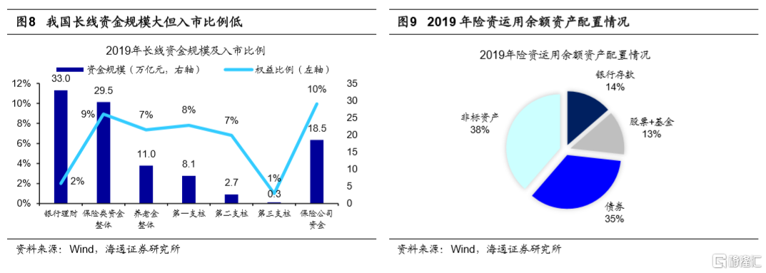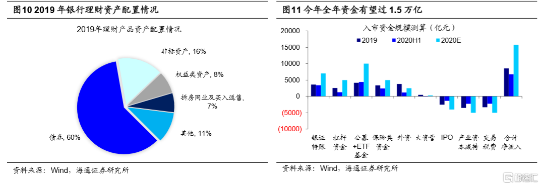 长线大钱也将持续流入。除了上述居民资金入市以外,今年下半年另一值得关注的是以外资、险资为代表的长线资金。外资方面,我们曾在《今年外资还会再流入吗?-20200407》中指出,虽然短期外资会因外盘扰动或汇率波动而流出(如今年3-4月疫情在海外蔓延引发外资大幅流出A股),但是长期看我国基本面良好且A股与国际股市相关性相对较低,因此外资长期对A股有配置需求。过去三年外资年度净流入均在3000亿上下,今年至今(截至2020/07/31)外资流入约为1600亿元,下半年我们预计外资还将流入1000亿上下。除了外资,另一长线资金是以险资和理财资金为代表的国内居民长钱。截至2019年,银行理财规模约为30万亿,保险类资金(养老金三大支柱+保险公司资金运用余额)规模也约为30万亿元,这些资金规模很大,但是投向权益的比例很低,如银行理财投资二级市场股票的比例不到2%,保险类资金整体投资权益的比例也不到10%,详细测算见我们前期报告《险资-“资产荒”再现-20191021》。这些长线资金在资产配置时低配权益的原因是刚兑的存在使得我国非标资产性价比畸高,同时我国股市虽然长期收益率不错,但是波动性也高,相比非标权益资产没有太大吸引力。展望未来,刚兑信仰打破是必然的趋势,刚兑打破后无风险收益率下行,权益资产的性价比将凸显,详见《打破刚兑是股权投资成人礼-20190830》。此外,近期政策也在力推长线资金入市,7月17日银保监会制定了《关于优化保险公司权益类资产配置监管有关事项的通知》,将设置差异化的权益类资产投资监管比例,上限将从当前的30%提高至最高45%。7月8日,21世纪经济报道,有大行表示旗下理财产品目前仅有2%不到的资产用于配置股票,目标是未来能提升到5%左右。因此下半年长线资金也将继续保持流入。整体来看,我们去年预计2020年将有1.1万亿增量资金入市,然而实际上在疫情的冲击下,今年宏观流动性保持宽松,基本面也在逐步修复,市场整体表现有韧性,因此我们上调前期预测值。我们预计2020年全年银证转账净流入7000亿元,公募基金+ETF入市10000亿元,杠杆资金入市5000亿元,保险类资金入市5000亿元,外资2500亿元,考虑IPO、产业资本减持及交易税费等流出项后全年资金净流入将超1.5万亿元。
