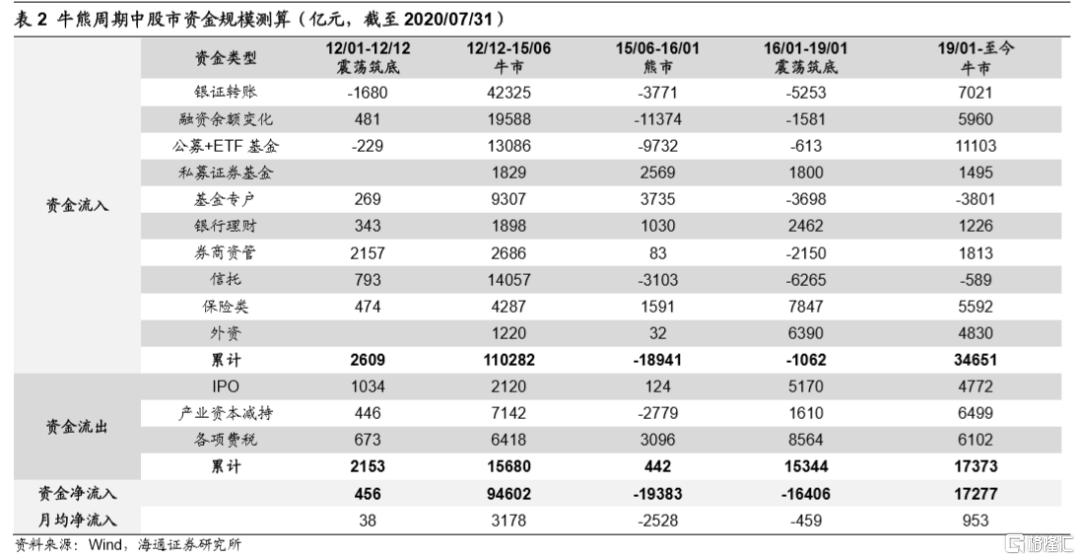 牛熊周期角度:牛市资金大幅流入,熊市资金大幅流出,震荡市资金紧平衡。根据我们在《穿越黑暗迎黎明——2019年A股投资策略-20181209》、《“牛”转乾坤——2020年A股投资策略-20191117》等多篇报告中的分析,1990年以来A股已经经历了五轮“牛市-熊市-震荡市”周期不断交替的过程。第一轮牛市是1991/01-1993/02,之后在93/02-94/07进入熊市,94/07-96/01震荡筑底。第二轮牛市是1996/01-2001/06,01/06-02/01是熊市,02/01-05/06震荡筑底。第三轮牛市是2005/6-2007/10,随后07/10-08/10进入熊市。第四轮牛市是2008/10-2011/11,2011/11之后市场进入熊市。如前所述,资金面的数据13年以来才有完整的指标,因此我们重点分析下13年以来牛熊周期中股市资金的供求关系。第五轮牛市以创业板指刻画从12年12月开始,以上证综指刻画从13年6月开始,市场一路走牛直至15/06上证综指的5178点,12/12-15/06期间股市资金整体大幅净流入9.5万亿元,月均约3200亿元,其中散户资金月均净流入约1400亿元,杠杆资金流入约650亿元,公募基金约流入约450亿元。5178点后,上证综指一路下跌至2016/1/27的2638点,期间股市资金由前期的大幅流入转为大幅流出1.9万亿元,月均流出约2500亿元,散户资金月均净流出500亿元,杠杆资金流出约1500亿元,公募基金流出约1300亿元。上证综指2638点至2019/01/04的2440点,市场整体维持震荡,资金净流出1.6万亿,月均净流出约460亿元,散户资金月均净流出约150亿元,杠杆资金月均流出44亿元,公募基金月均流入18亿元。我们认为,上证综指19年1月4日的2440点是第六轮牛市的起点,至今市场走势虽有波折,但整体处在中枢向上的牛市中。从资金面上看,19年初至今股市资金净流入1.7万亿,月均流入近千亿元,散户资金月均净流入约350亿元,杠杆资金月均流入330亿元,公募基金月均流入650亿元。与在年度资金测算中一样,我们将指数的涨跌幅与资金量做一个比值,12/12-15/06牛市中上证综指每上涨1个百分点对应约700亿资金流入,15/06-16/01熊市中上证综指每下跌1个百分点对应约400亿资金流出,19年1月以来上证综指上涨超过30%(截至20200731),同时有1.7万亿资金入市,指数1个百分点的涨幅对应约600亿的资金,因此从资金面上看19年以来市场进入了牛市。