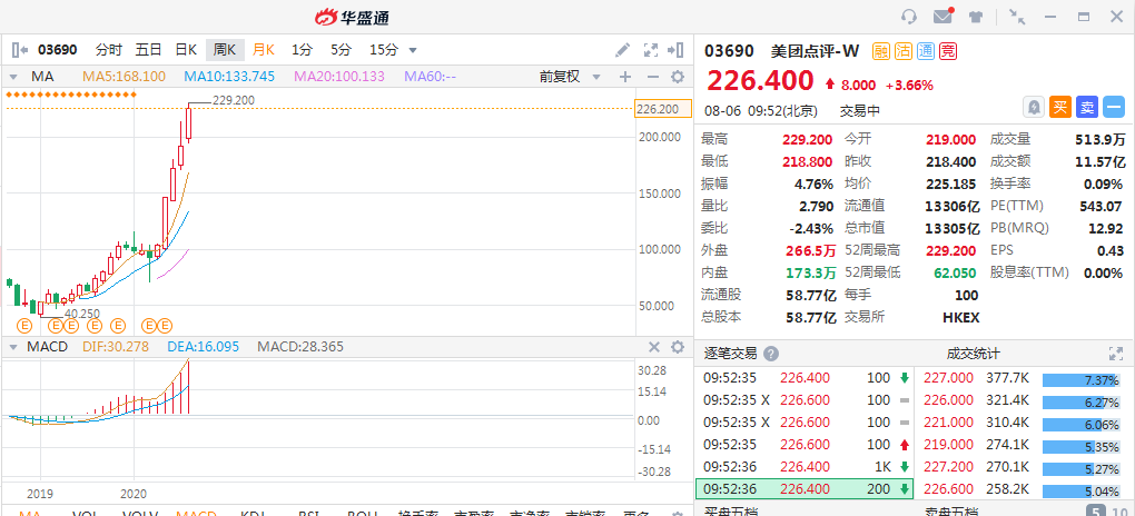 美团点评-W再创新高,盘中最高见229.2港元,现报226.4港元,涨幅3.66%,最新总市值1.3万亿。