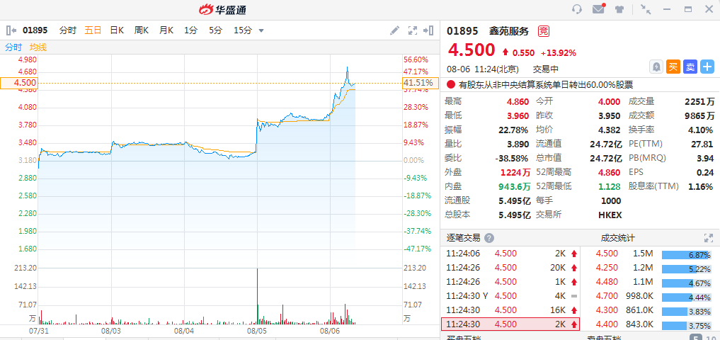 鑫苑服务股价今日再度走高,目前涨逾13%,该股昨日收涨18%,股价两日涨超30%。