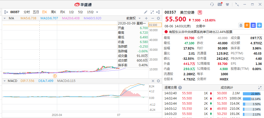 美兰空港(0357.HK)大涨15%,报55.5港元再创历史新高,今年迄今股价累涨近900%,累计涨幅位列港股市场第一,总市值超262亿港元。