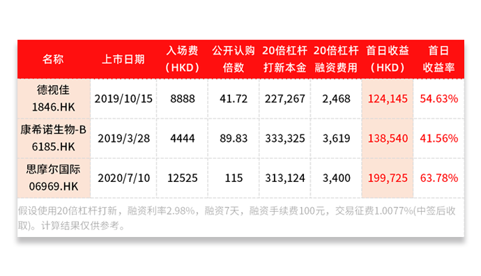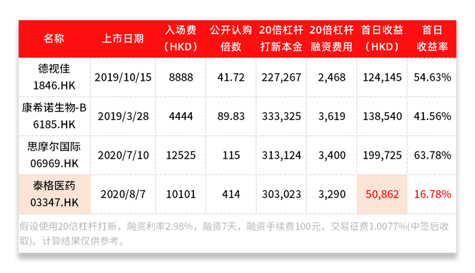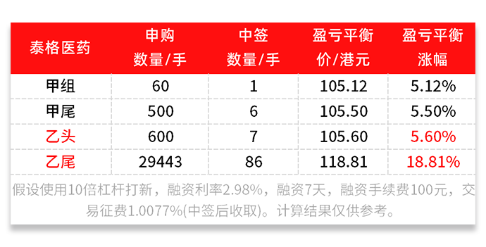 泰格医药乙头需申购600手,可获配7手。打新本金30万港元,融资费用3290港元(采用20倍杠杆)。假如泰格医药涨幅达到21.5%,其乙头首日收益可达5万港币,收益率16.78%,相对于前三只大肉签来说收益率还算不错。