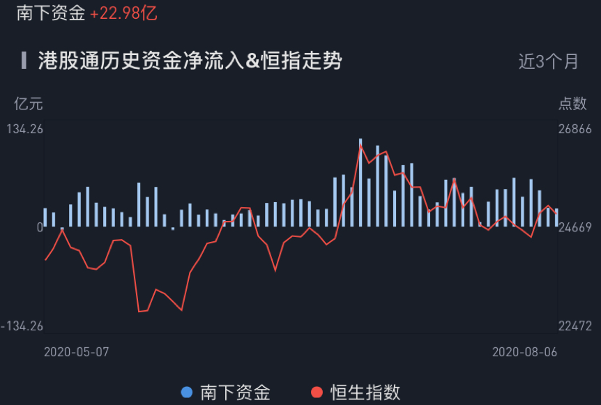华盛资讯8月6日讯,南下资金今日净流入港股22.98亿港元,流入规模较上一交易日略微减少。北上资金今日小幅流出A股0.98亿元,由净流入转为净流出。