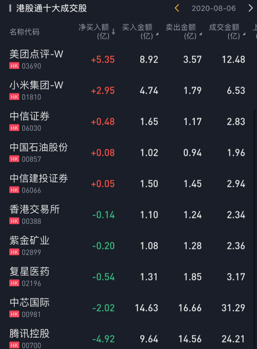 个股方面,今日南下资金净买入美团点评5.35亿港元,净买入小米集团2.95亿港元,净买入中信证券0.48亿港元;净卖出腾讯控股4.92亿港元,净卖出中芯国际2.02亿港元。