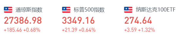 周四,美股表现出色。截止收盘,道琼斯指数上涨185.46点,涨幅0.68%报27386.98点;标准普尔500指数上涨21.39点,涨幅0.64%报3349.16点;纳斯达克指数上涨109.67点,涨幅1.00%报11108.07点