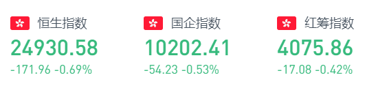 周四,恒指高开低走,一度大跌1.8%,午后恒指跌幅收窄。截至收盘,恒生指数跌0.69%,报24930.58点;国企指数跌0.53%,报10202.41点;红筹指数跌0.42%,报4075.86点。