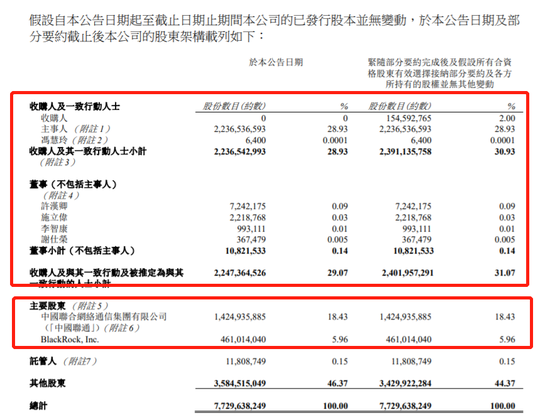 收购完成后,李泽楷持股将从28.93%增加至30.93%,中国联通持股18.43%,黑石持股5.96%。