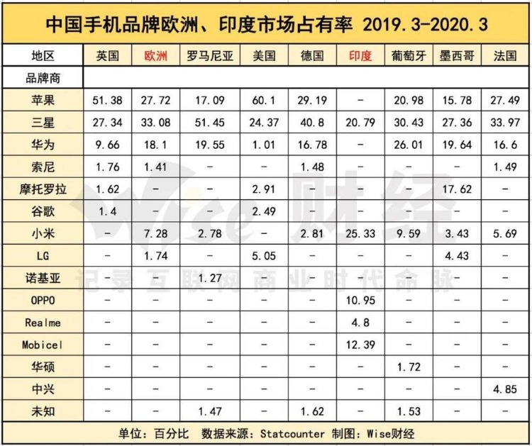 《Wise财经》曾在《中国手机子品牌大战》一文中提及中国手机品牌海外市场占有率情况,在印度,排名第一的是小米,紧随其后的是三星、Mobicel、OPPO、和Realme,而印度本土品牌已几乎无缘排名,除了中国品牌,仅有南非第二大手机品牌Mobicel出现在排行榜中。