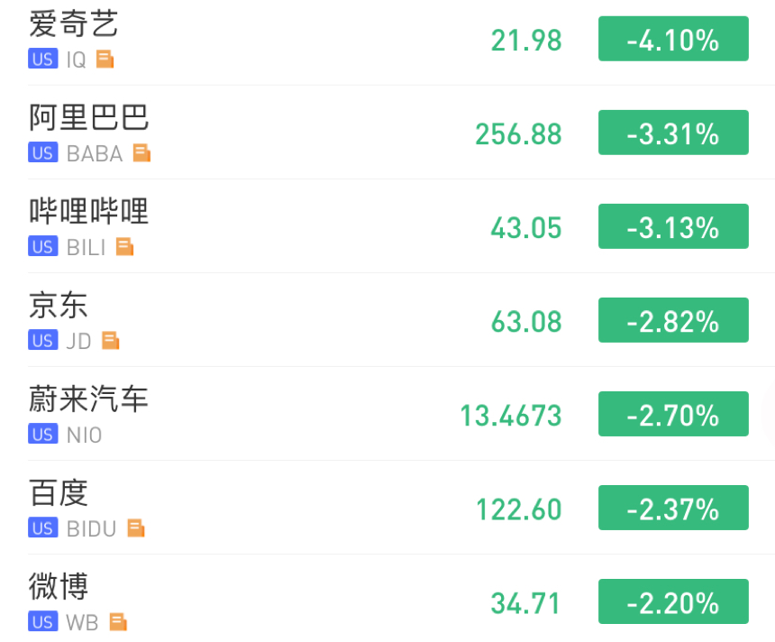 华盛资讯8月7日讯,受特朗普行政令事件影响,热门中概开盘一齐跳水。截至发稿,爱奇艺跌4.1%,阿里跌3.31%,哔哩哔哩跌3.13%。京东跌2.82%,蔚来跌2.7%。