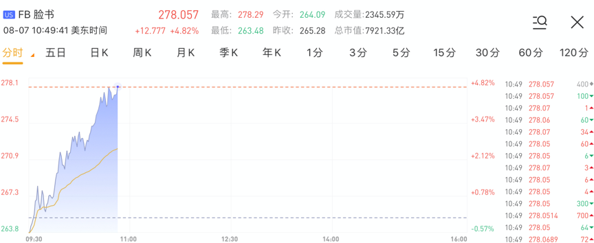 华盛资讯8月7日讯,Facebook(FB)股价再创新高,市值逼近8000亿美元。截至发稿,FB股价涨4.82%,报278.05美元,当前总市值为7921.33亿美元。