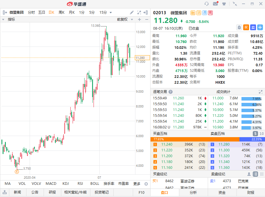 截至2019年12月31日止的全年度业绩为营业额14.37亿元人民币,增长超过六成六,并转亏为盈,股东应占盈利3.12亿元人民币,期内整体毛利率小跌4.3个百分点至55.5%。集团现时利用中心化的慧智商业解决方案,为中小企业实现数字化转型。 SaaS软件内产品有商业云,以协助商户开设线上服务,并提升客户参与。营销云则通过大数据分析和人工智能技术协助商户智能营销。更可通过数据管理平台DMP或相关煤体资料上之平台广告,以支持移动社交平台的解决方法。而销售云主力在提升客服能力,并取得更高销售成绩。同时推出Paas微盟平台,将集团内的核心服务齐集于平台上。并提供给第三方开发商应用。更可自行按设计或发布设定应用程式。集团主要合作伙伴腾讯,利用微信小程序及公众号上提供SaaS产品。并通过朋友圈、公众号、QQ,或视频广告传递营销服务。