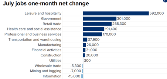 休闲和酒店业、政府、零售贸易业、专业和商业服务业、其他服务业和医疗保健领域的就业人数显著增加。美国7月新增就业人数超过预期,餐饮服务业人员大量返工,带动休闲和酒店行业新增50多万个就业岗位。而食品服务业的招聘潮也带动了休闲酒店业的就业数据。因为餐馆重新的开张,厨师、服务员和调酒师的就业人数因此重新增加。