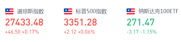 周五,道指低开约68点,走势反复,尾盘拉升,由跌转涨;截至收盘,道指涨46.50点或0.17%,报27433.48点;纳指跌97.09点或0.87%,报11010.98点;标普500指数涨2.12点或0.06%,报3351.28点。