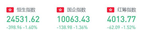 上周五在外围利空消息的影响下,恒指早盘一度暴跌逾700点,随后跌幅逐渐收窄,全天呈探底回升走势。截至收盘,恒生指数跌398.96点或1.6%,报24531.62点,全日成交额达1778.28亿。国企指数跌1.52%,报4013.77点,红筹指数跌1.6%,报24531.62点。