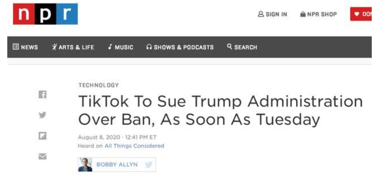 NPR(美国国家公共电台)援引未具名直接参与者的话报道称,TikTok最早将于周二提起联邦诉讼,挑战总统特朗普在美国封禁该视频共享服务的行政命令。