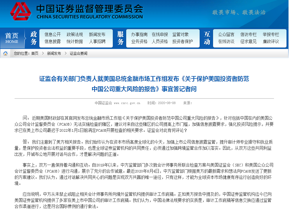 证监会有关部门负责人8月8日就美国总统金融市场工作组发布《关于保护美国投资者防范中国公司重大风险的报告》事宜答记者问,证监会表示,在资本市场高度全球化的今天,加强上市公司信息披露监管,提升审计师专业操守和执业质量,是保护投资者合法权益的重要手段,也是全球证券监管机构的共同责任,必须通过加强跨境监管合作加以落实。因此,从双方这些共同利益出发,开诚布公地开展对话与合作,才是解决问题的正道。
