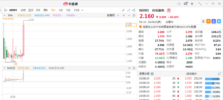 截至发稿,和泓服务涨16.13%,报2.16港元,成交额220.2万港元。