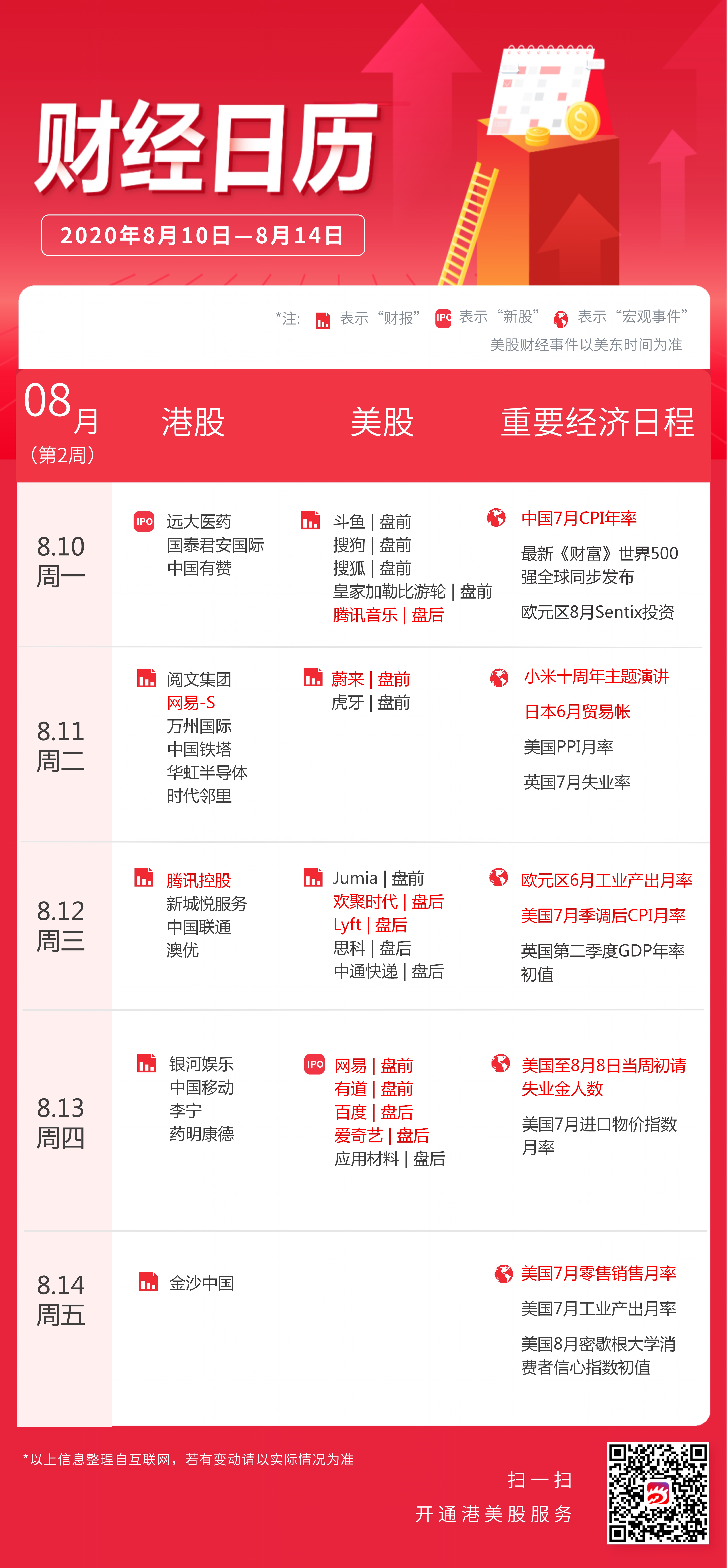 本周公布中国7月CPI年率、最新世界500强排行榜;雷军小米十周年演讲周二开启;国际数据方面,荷兰国际银行表示,本周美国数据料现复苏迹象,预计未来一周公布的美国经济数据将体现出美国经济复苏的迹象,美国7月NFIB小型企业信心指数将再次上升,CPI也将上扬,“恐怖数据”美国7月零售销售月率预计也将略高于市场预期。