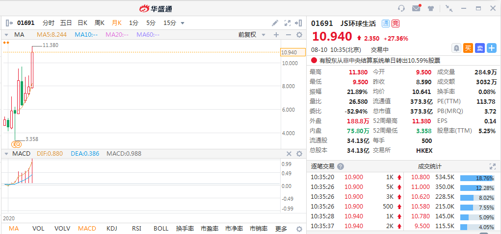JS环球生活大涨27.36%,报价10.94港元,成交额3032万。