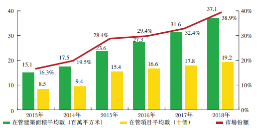 近年来,随着快速城镇化及人均可支配收入的不断增长,物业服务百强企业的在管建筑面积及物业数目迅速增加。物业服务百强企业的在管物业总建筑面积平均数由2014年的1750万平方米增至2018年的3710万平方米,复合年增长率为20.7%。