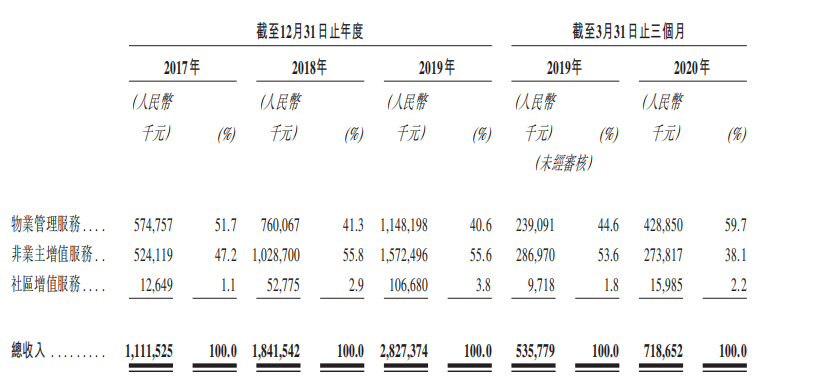 分业务来说,物业管理服务和非业主服务是公司2019年之前的主要收入来源。招股书显示,2019年,公司物业管理服务实现营业收入11.48亿元,占公司总营业收入的40.6%;非业主增值服务实现营业收入15.72亿元,占公司总营业收入的55.6%。
