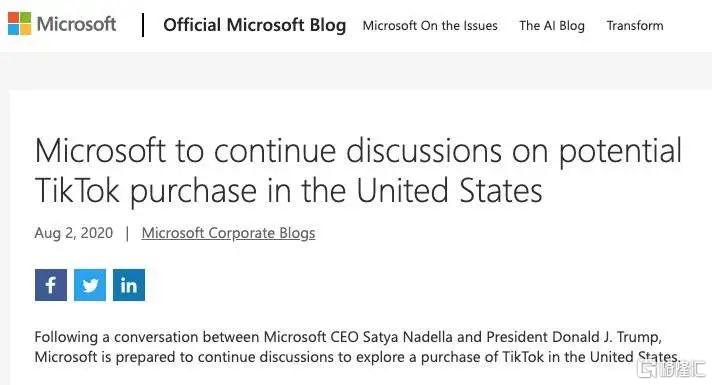 知情人士透露,微软已经就TikTok的收购与字节跳动进行了数周的谈判。8月1日,特朗普在空军一号接受采访时说到禁止TikTok,导致微软暂停了收购谈判。但在微软CEO纳德拉与特朗普总统交涉后,微软重启了收购谈判。