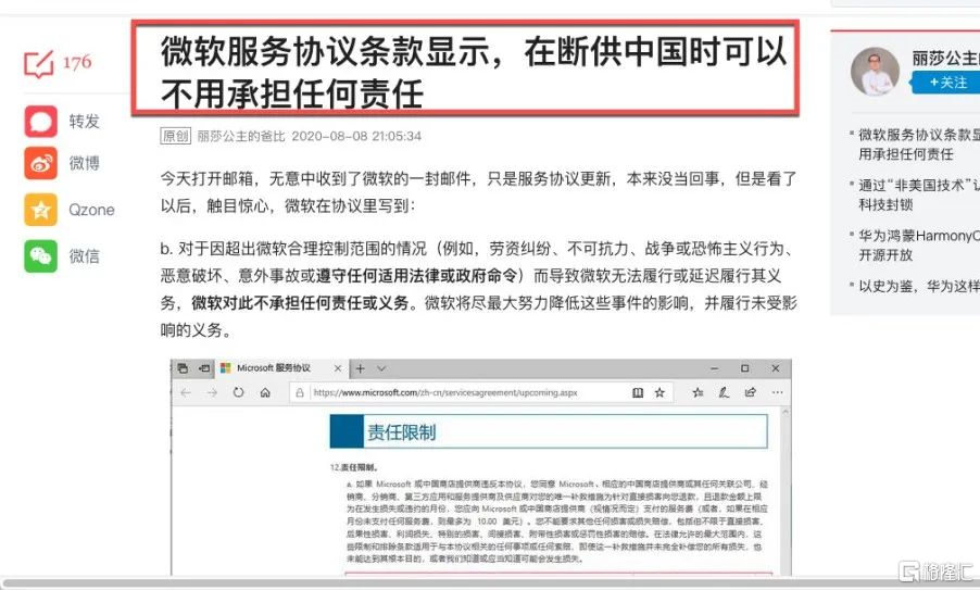 9日,中文社交媒体上有传言称,微软公司在其官网更新了服务协议,声明如因不可抗力导致微软无法履行或延迟履行其义务,微软对此不承担任何责任或义务。甚至有解读称,微软最近紧急修改了协议,暗示如果美国政府对微软下达禁令,微软可能断供中国,且不提供任何补偿。