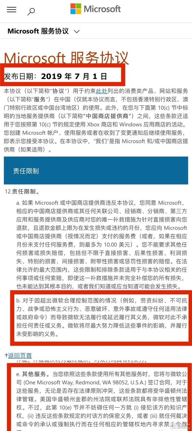 然而事实上,这并非微软新加入的协议内容。该文字表述与微软2019年7月1日发布、8月30日实施的服务协议同一条款内容完全一致。另据了解,微软至少在2016年,就引用过相关表述。而且这个协议不只针对中国大陆,在2019年英国版的协议中也包含类似表述。有分析称,这是跨国公司在实际业务中规避政治风险的一种常见操作。记者注意到,微软此次服务协议更新共包含14项新内容,大多涉及相关业务线内容条例变更,并无“断供中国不负责”的暗示。