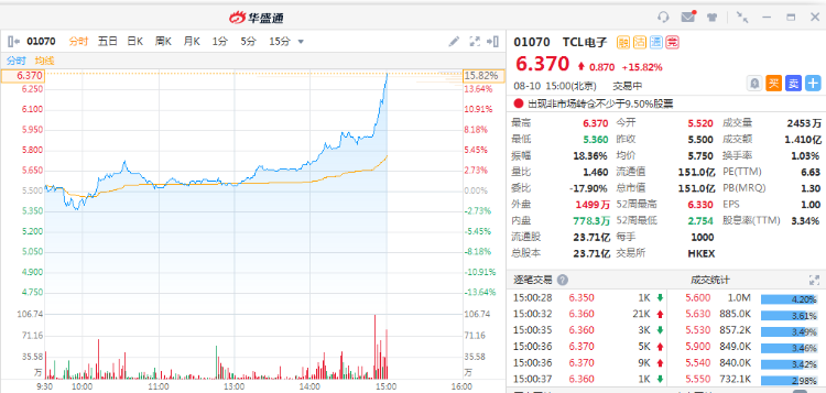 智通财经APP获悉,TCL电子(01070)午后涨幅扩大至15.82%,高见6.37港元创逾五年新高。