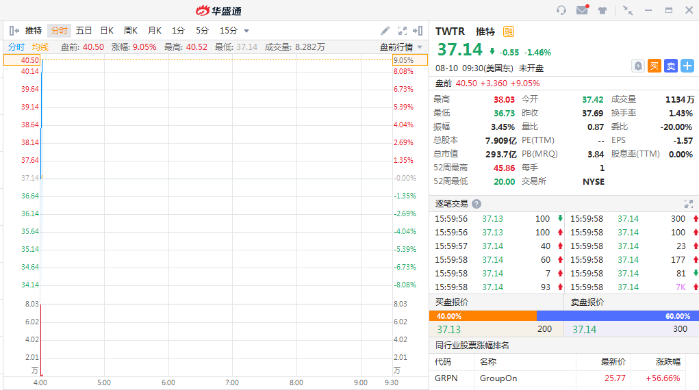 推特盘前大涨9%,目前股价报40.5美元。