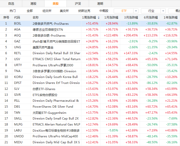 上周ETF的大行情又回来了!因为天然气再次崛起,白银涨势也继续提速,2倍做多天然气的BOIL一周累涨高达51.45%,不带杠杆的天然气基金都有25%的傲人涨幅。