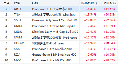 其他ETF中,做多罗素2000指数、太阳能、标普小型股、生物技术股等ETF也在上周脱颖而出。