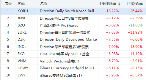 一周“牛市接力棒”上周主要交到了亚洲国家手中,韩国、日本、印度、越南都获得优异表现,而3倍做多韩国股指的KORU已经连续第2周位列第一,上周大涨18.22%。