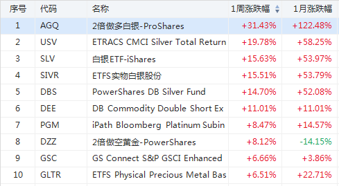 白银也是妥妥的赢家,2倍做多白银的AGQ涨幅达31.43%,已经连续第8周上涨。
