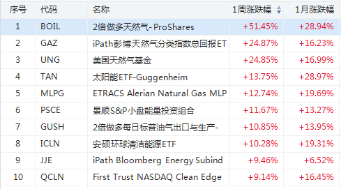 受益于此,做多天然气的ETF成了能源ETF涨幅榜中的主要焦点,美国天然气基金UNG一周涨近25%,而2倍杠杆的BOIL则达到了惊人的51.45%。