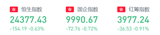 恒生指数开盘跌0.63%,全天窄幅震荡。截至收盘,恒生指数跌154.19点或0.63%,报24377.43点,全日成交额达1352.83亿。国企指数跌0.72%,报9990.67点,红筹指数跌0.91%,报3977.24点。