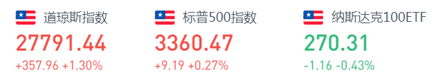 截至收盘,道琼斯指数涨357.96点,涨幅1.3%,报27791.44点;标普500指数涨9.68点,涨幅0.29%,报3360.96点;纳斯达克综合指数跌42.63点,跌幅0.39%,报10968.36点。