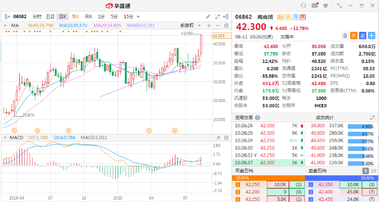 新浪港股讯 8月11日消息,海底捞今日大涨11%,报价42.30港元,市值2241亿港元。