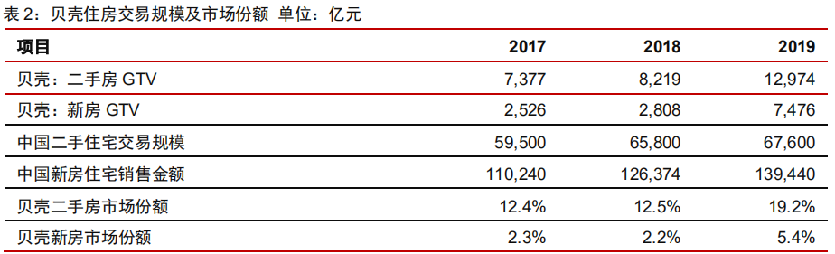 2019 年,贝壳平台促成了 1.30 万亿的二手房销售和 0.75 万亿的新房销售(一手渠道及代理,但主要以渠道为主),分别占当年全国二手房和新房交易金额的 19.2%和 5.4%,公司的市占率处于业内领先地位。