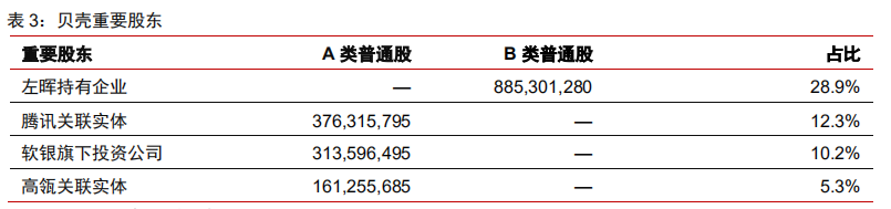 贝壳的重要股东包括腾讯、软银及高瓴等知名投资机构,公司管理层也均持有不同程度股份,这些大机构的真金白银充分表明了他们对贝壳的看好。