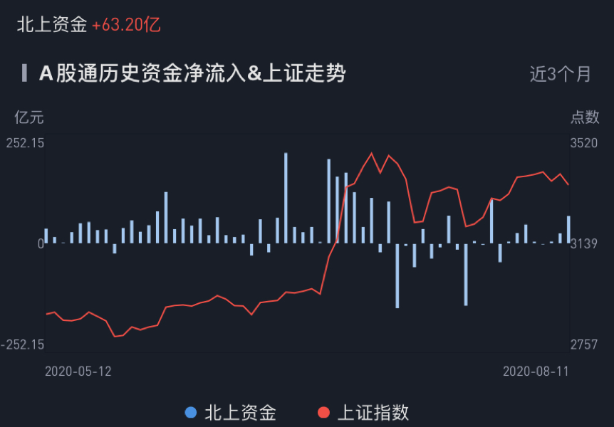 华盛资讯8月11日讯,南下资金今日净流入港股19.02亿港元,流入规模较前上一交易日有所下滑。北上资金今日流入A股63.20亿元,流入规模显著增加。