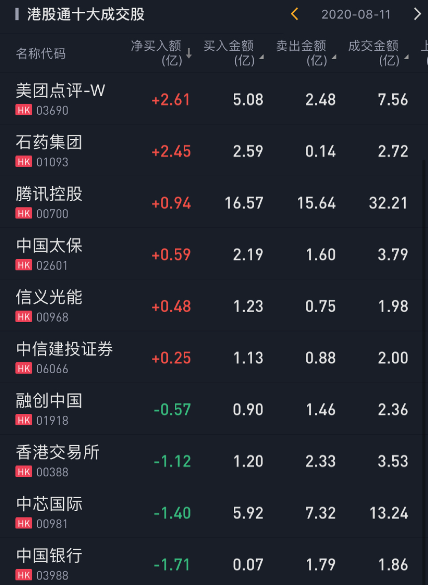 个股方面,今日南下资金净买入美团点评2.61亿港元,净买入石药集团2.45亿港元,净买入腾讯控股0.94亿港元,净买入中国太保0.59亿港元,净买入信义光能0.48亿港元。